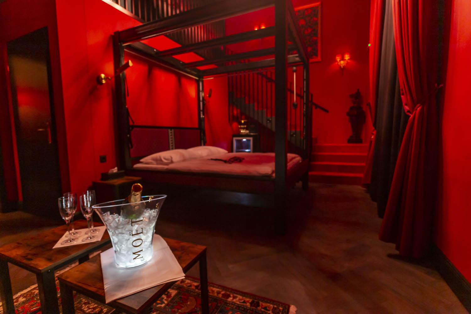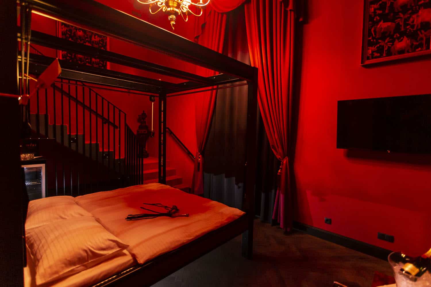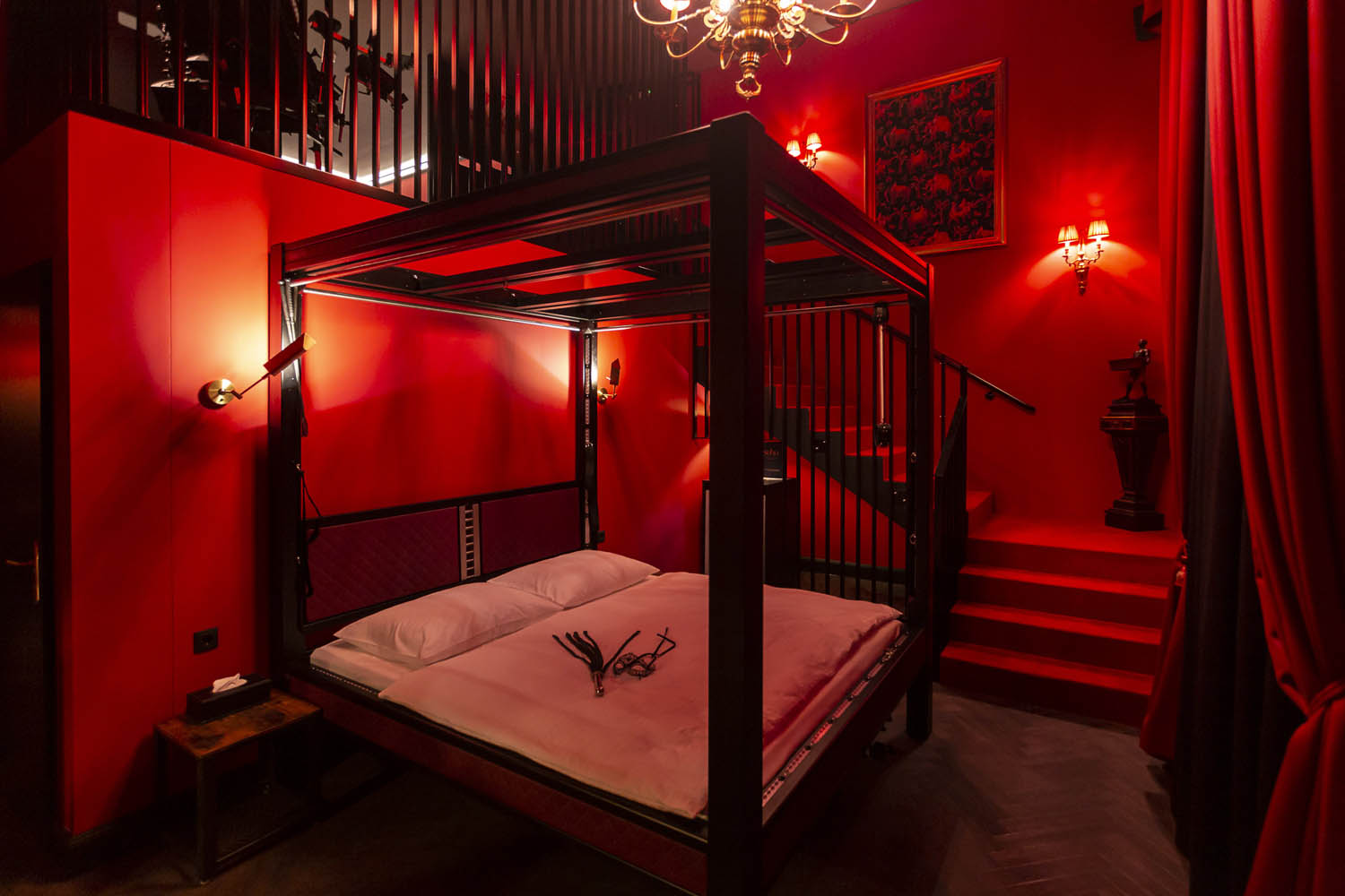 In der roten Suite taucht man in eine Welt voller Kontraste ein – dramatisch, sanft, elegant, streng. Eingehüllt in ein schwarz-rotes Gewand mit goldenen Akzenten zeigt sich der hohe Raum und offenbart die facettenreiche Welt zwischen Lust und Laster.